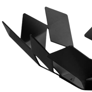 Centrotavola dinamico e leggero. L'intreccio asimmetrico delle piastrine in acciaio nero crea una presenza scenografica perfetta per un living moderno