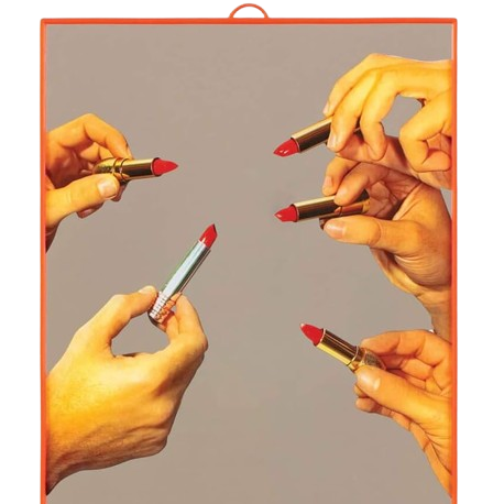 Uno specchio che rompe gli schemi del design tradizionale con l'irriverente grafica dei rossetti, perfetto per chi vuole aggiungere un tocco di pop-art provocatoria