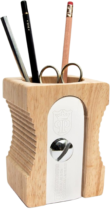 Un temperino gigante in legno di gomma e acciaio inossidabile che trasforma un oggetto minuscolo in un contenitore iconico e funzionale, perfetto per chi non vuole una scrivania banale